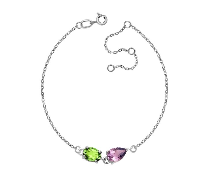Браслет из серебра 925 пробы с перидотом и аметистом. Плетение Якорное